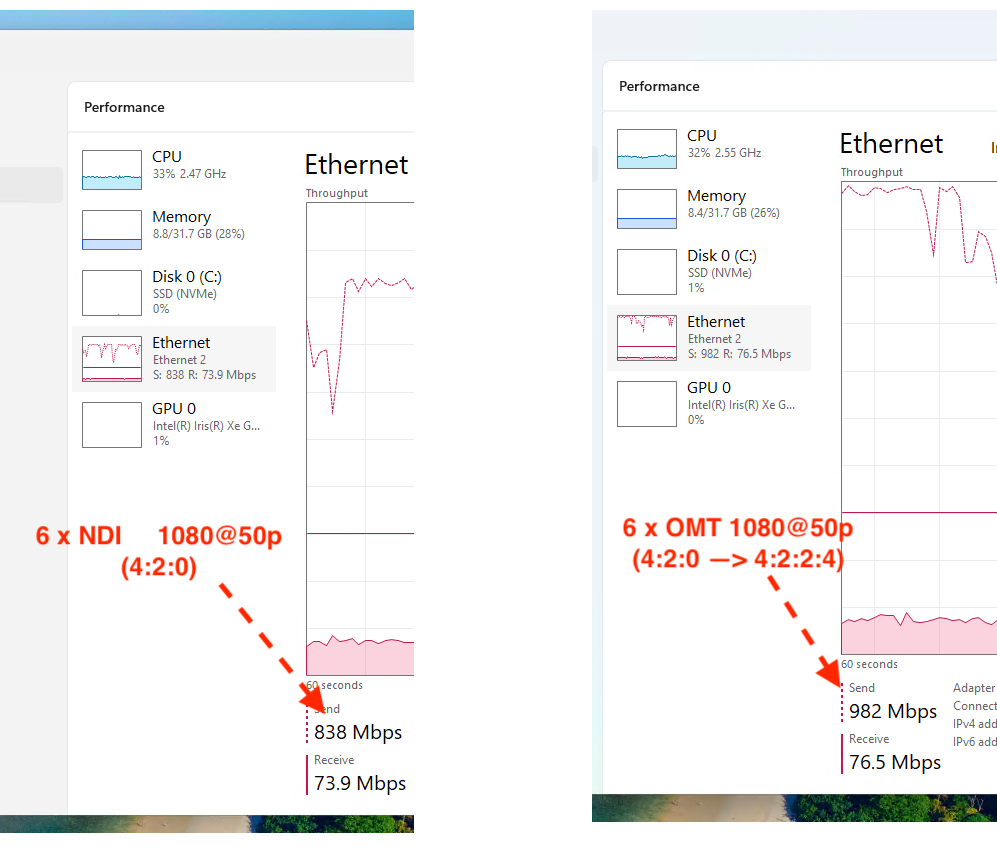 For example, if the input were NV12 (4:2:0), OMT would internally convert it to 4:2:2:4, while NDI would process the 4:2:0 signal natively. As a result, OMT would consume more bandwidth, skewing the comparison.