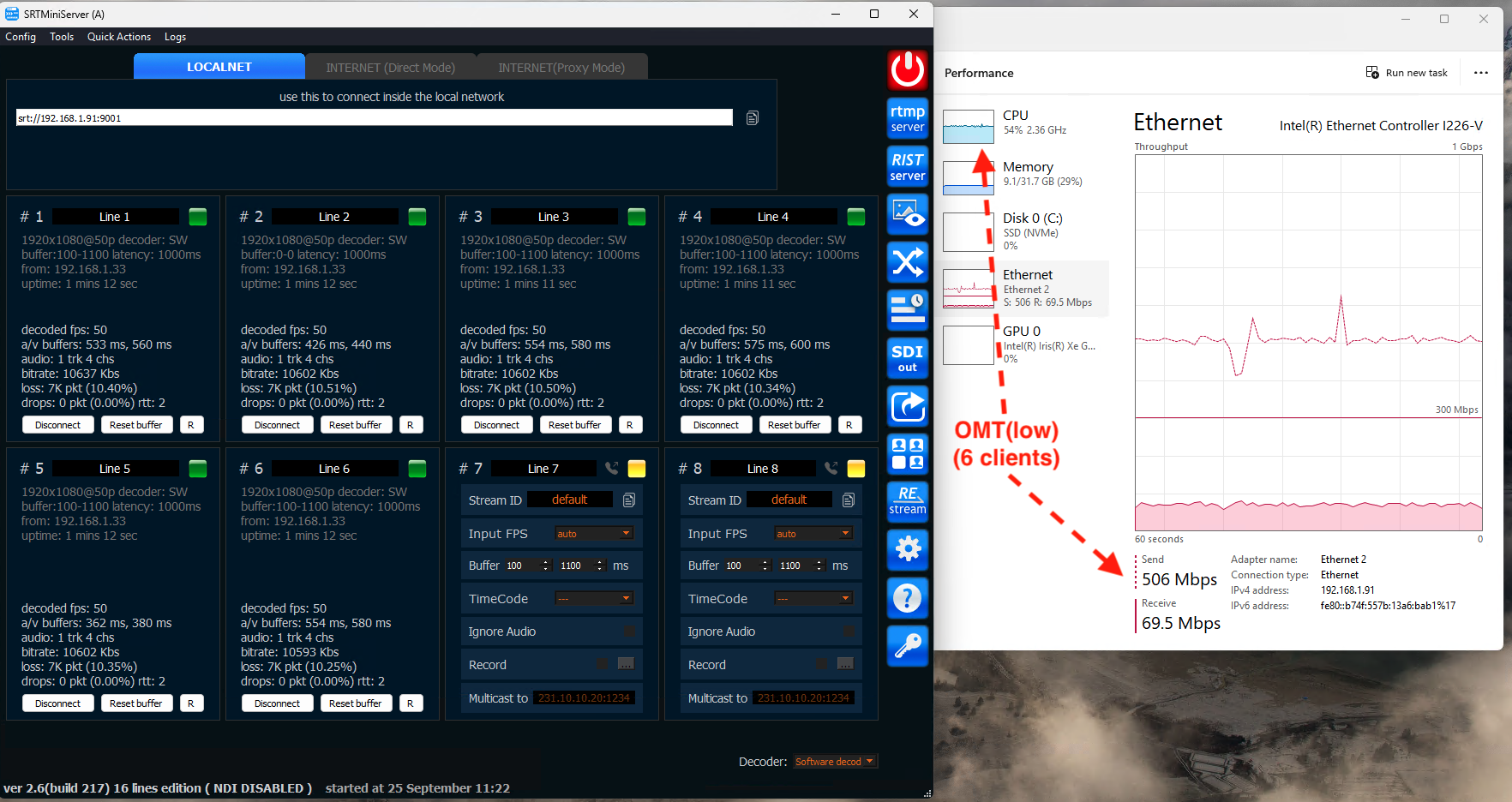 Result for 6xOMT(low) output: +9% CPU, 506 Mbs