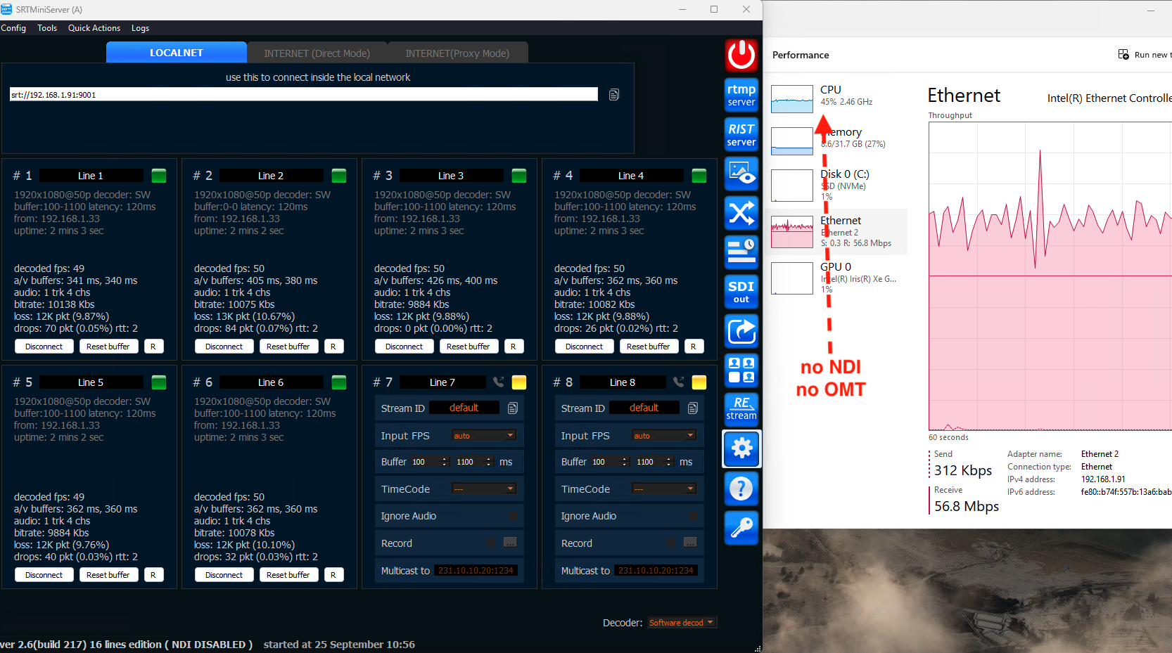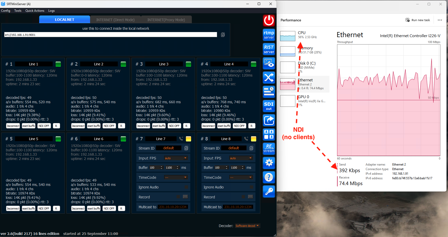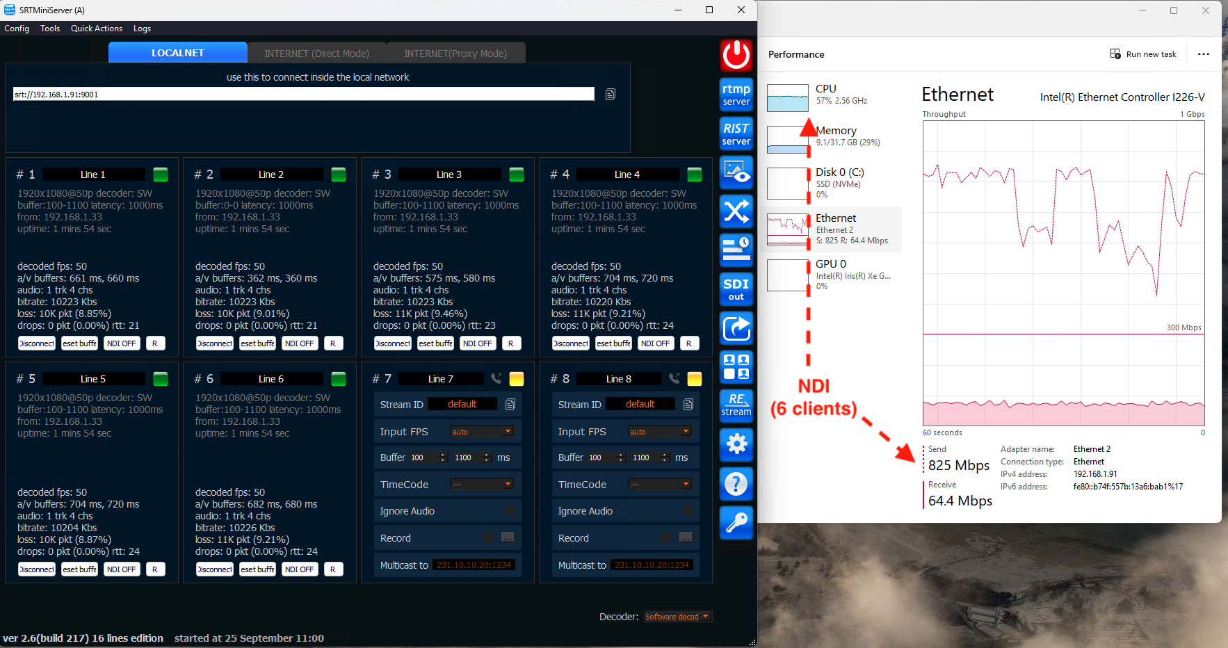 Result for 6xNDI output: +12% CPU, 825 Mbs