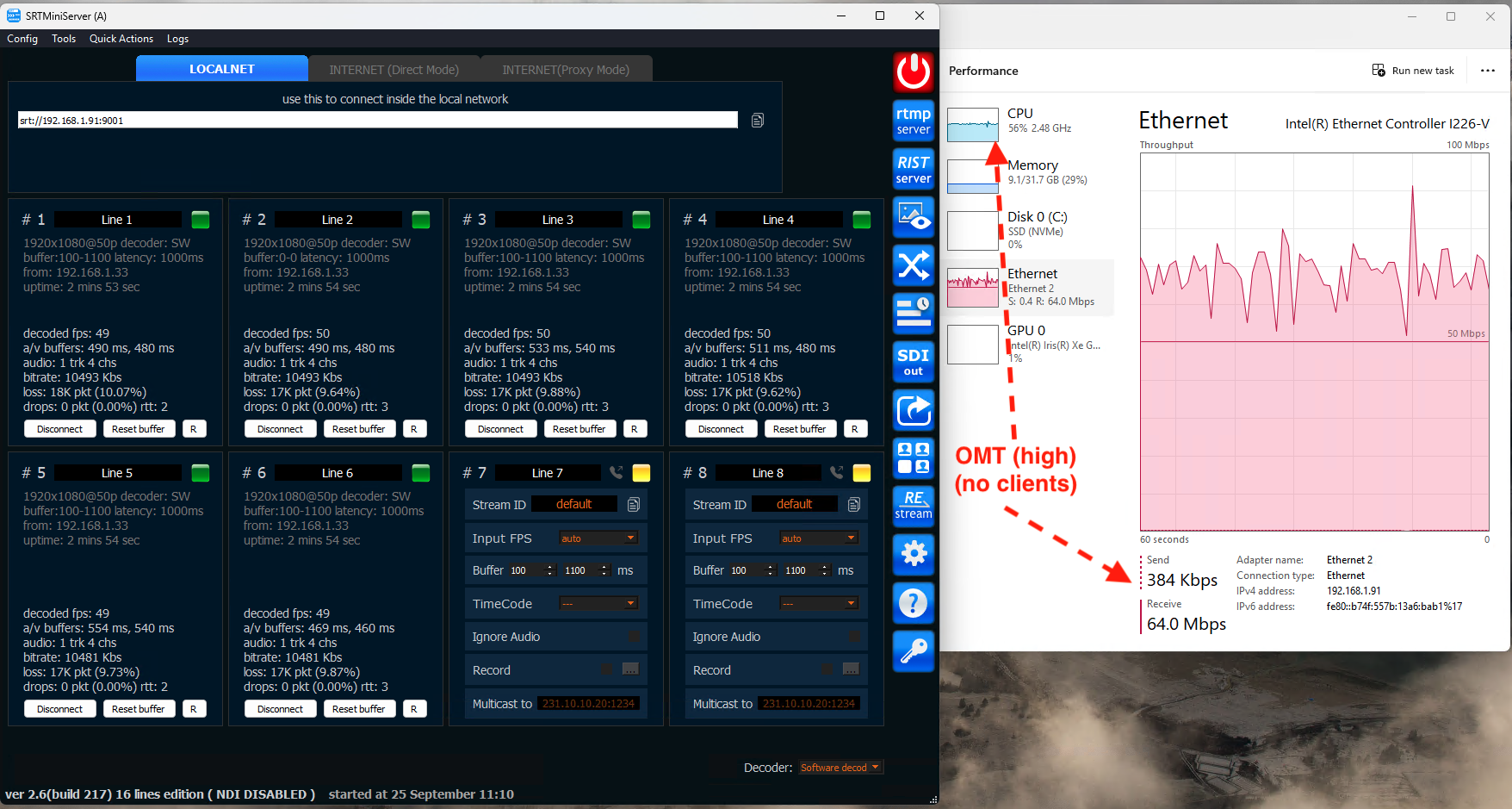 Result for 6xOMT(high) output: +11% CPU, 865 Mbs